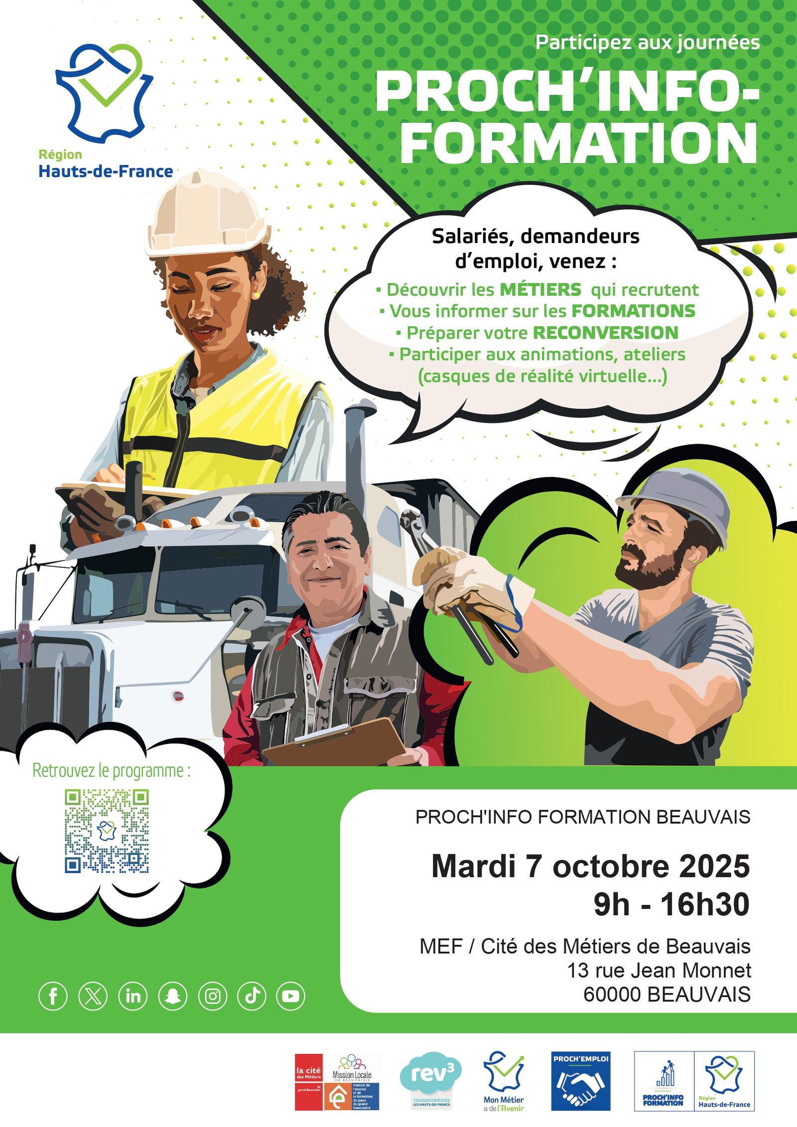 Organisée par Proch’Info Formation, en partenariat avec la MEF / Cité des Métiers de Beauvais, la Journée Portes Ouvertes se tiendra le mardi 7 octobre 2025, de 9h00 à 16h30, à la MEF / Cité des Métiers – 13 rue Jean Monnet, 60000 Beauvais.