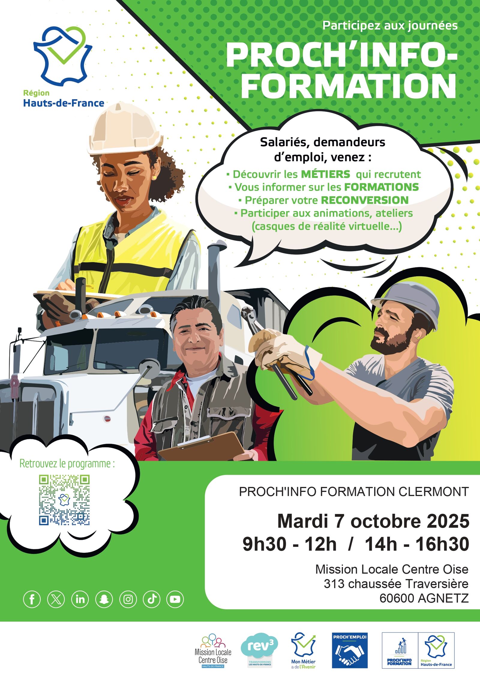 La Mission Locale Centre Oise organise la Journée Proch’Info Formation, qui se tiendra le mardi 7 octobre 2025, de 9h30 à 12h00 et de 14h00 à 16h30, dans ses locaux au 313 chaussée Traversière à 60600 Agnetz.
