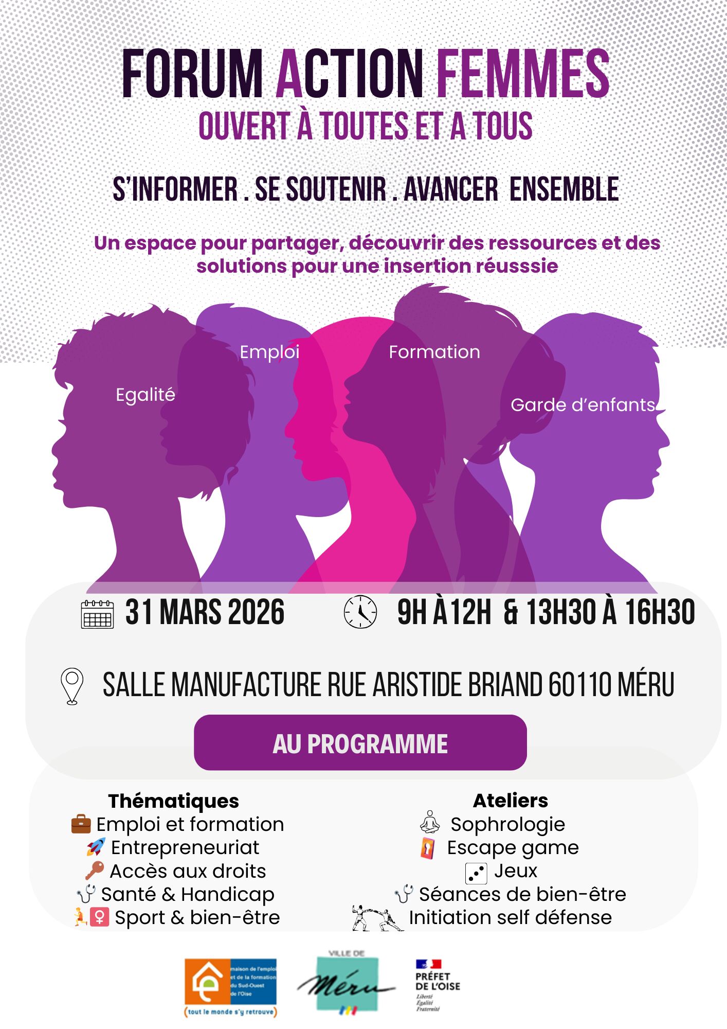 Le mardi 31 mars 2026, la ville de Méru accueille une nouvelle édition du Forum Action Femmes. Cet événement, ouvert à toutes et à tous, est un espace privilégié de partage et de découverte pour trouver des solutions concrètes en faveur d'une insertion réussie.