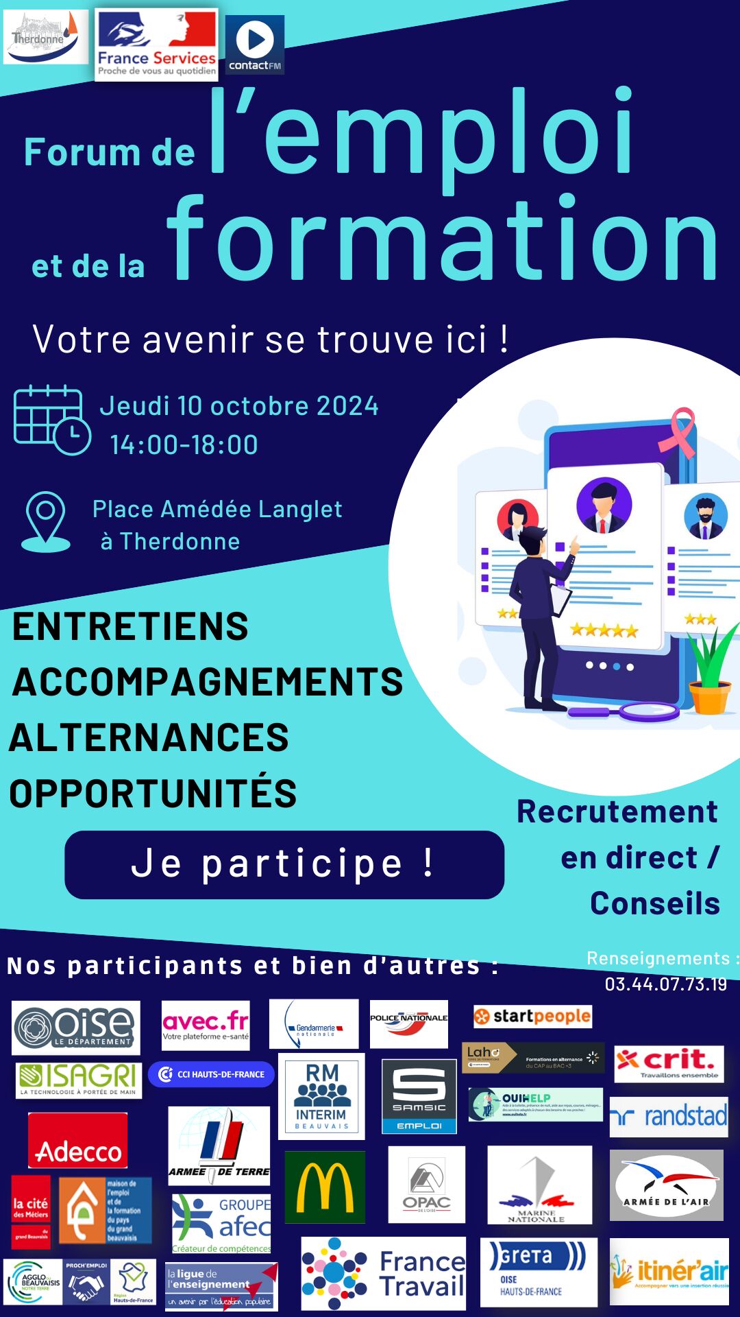Le Forum de l'Emploi et de la Formation se tiendra le jeudi 10 octobre 2024 à la Place Amédée Langlet à Therdonne, de 14h00 à 18h00.