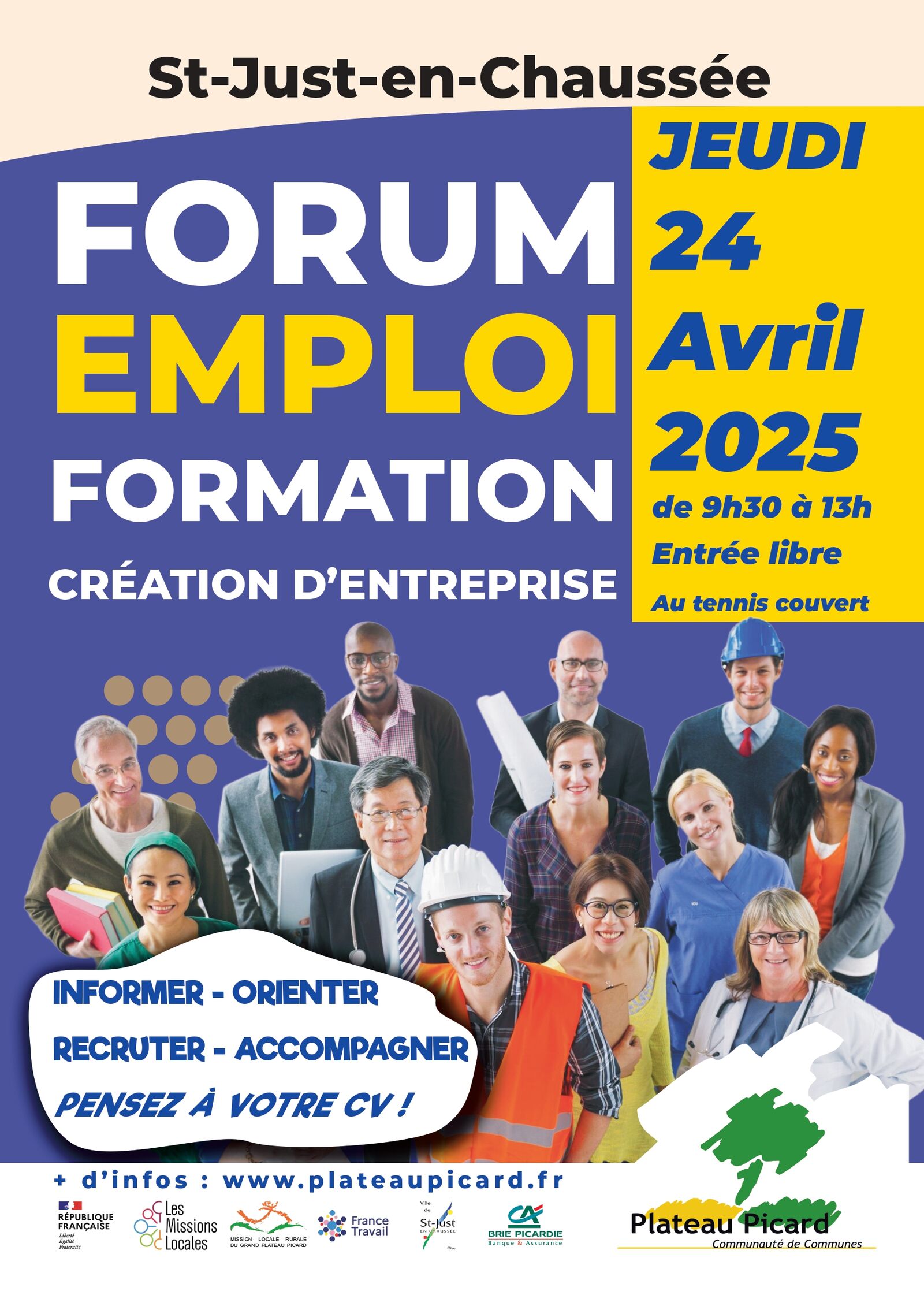 Le jeudi 24 avril 2025, de 9h30 à 13h, la ville de Saint-Just-en-Chaussée accueillera un Forum Emploi et Formation au tennis couvert.