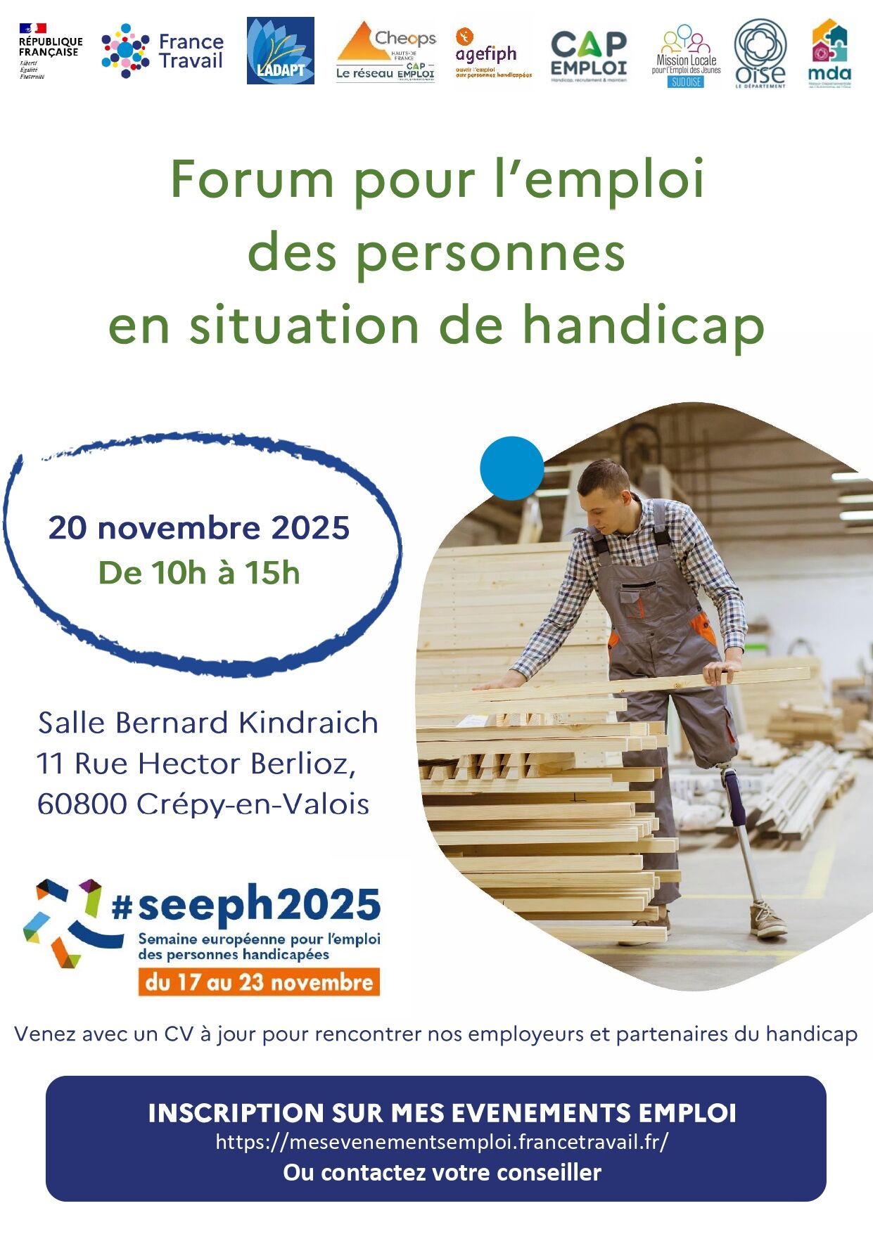 Dans le cadre de la Semaine Européenne pour l’Emploi des Personnes Handicapées (SEEPH) 2025, un Forum pour l’emploi des personnes en situation de handicap se tiendra le jeudi 20 novembre 2025, de 10h à 15h, à la Salle Bernard Kindraich, 11 rue Hector Berlioz à Crépy-en-Valois.